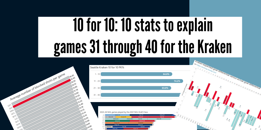 The Seattle Kraken’s win against the Flames on Monday marked the 40th game of the season and therefore brings another installment of 10 for 10, where I go through 10 stats that add context and color to the Kraken’s season to date and how things are trending.