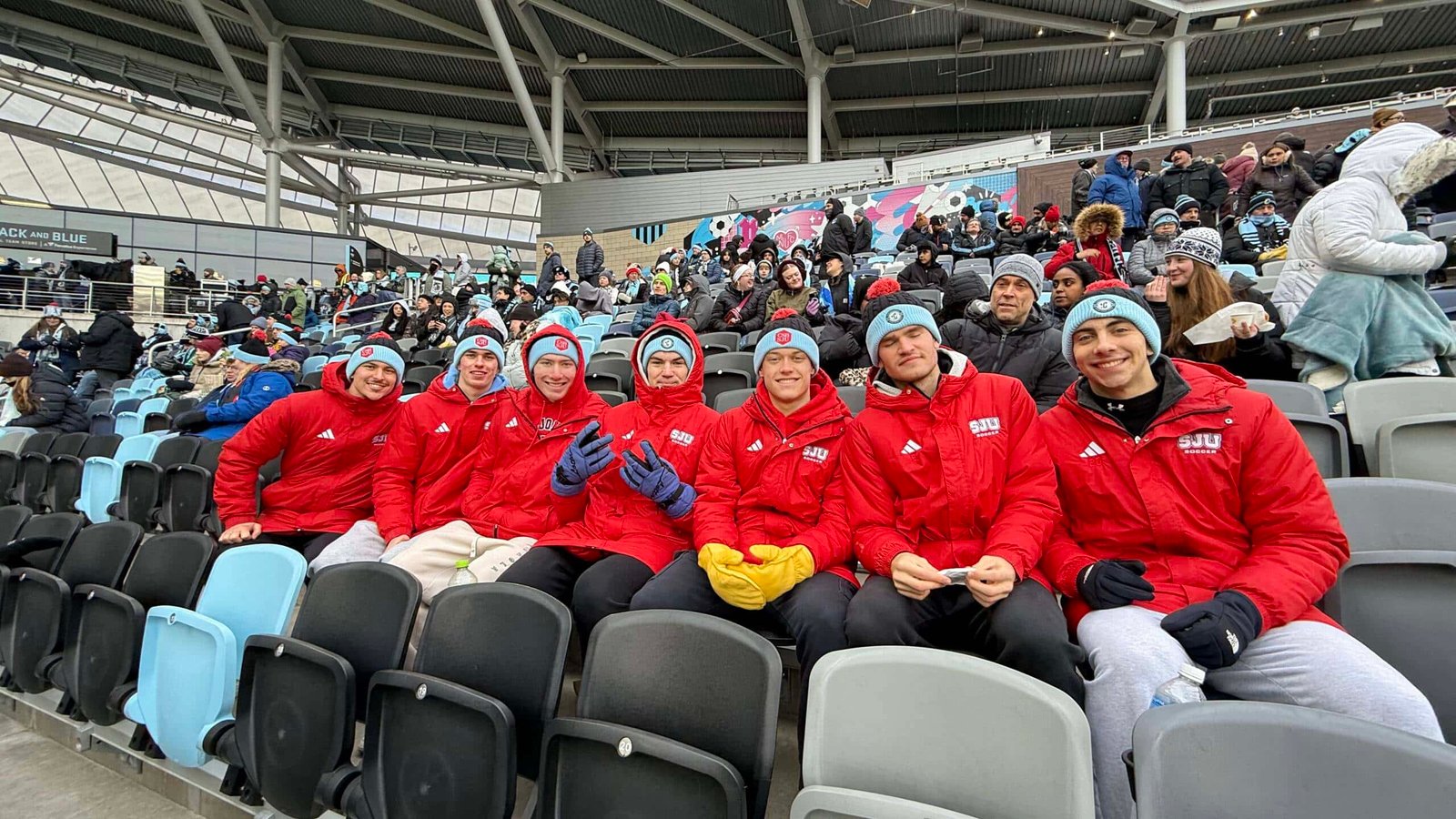With the temperature hovering around 20 degrees, the headgear – handed out at the gates to Allianz Field by members of the SJU soccer team – proved popular with the sellout crowd, many of whom were employees, family and friends of CSB and SJU.