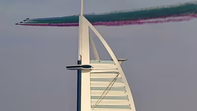The Al-Fursan National Aerobatic team performs a commemorative flypast over the Dubai coastline and the Burj Al-Arab (AFP)