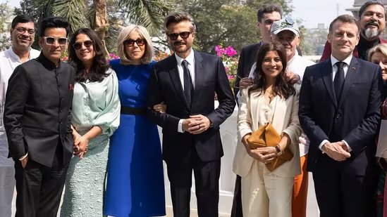 The first picture showed President Macron and Bridgitte posing with Manoj Bajpayee, Anil Kapoor, Zoya Akhtar, Richa Chadha, Shabana Azmi, Ricky Kej, and others. Some pictures also show Anil and Richa interacting with the President and dignitaries, while another group picture shows them all posing at the Gateway of India.
