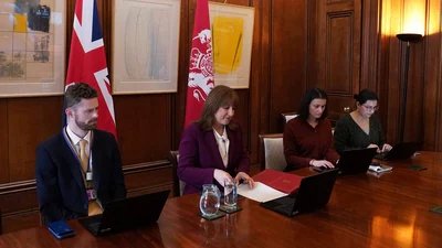 Britain’s Chancellor of the Exchequer Rachel Reeves (2L) sits down to take part in a G7 Finance Ministers video call to discuss the situation in the Middle East (AFP)