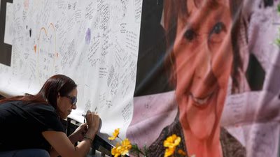 Catalina Ochoa visits a memorial for Nancy Guthrie in front of the KVOA news station on March 3. (Getty Images via AFP)