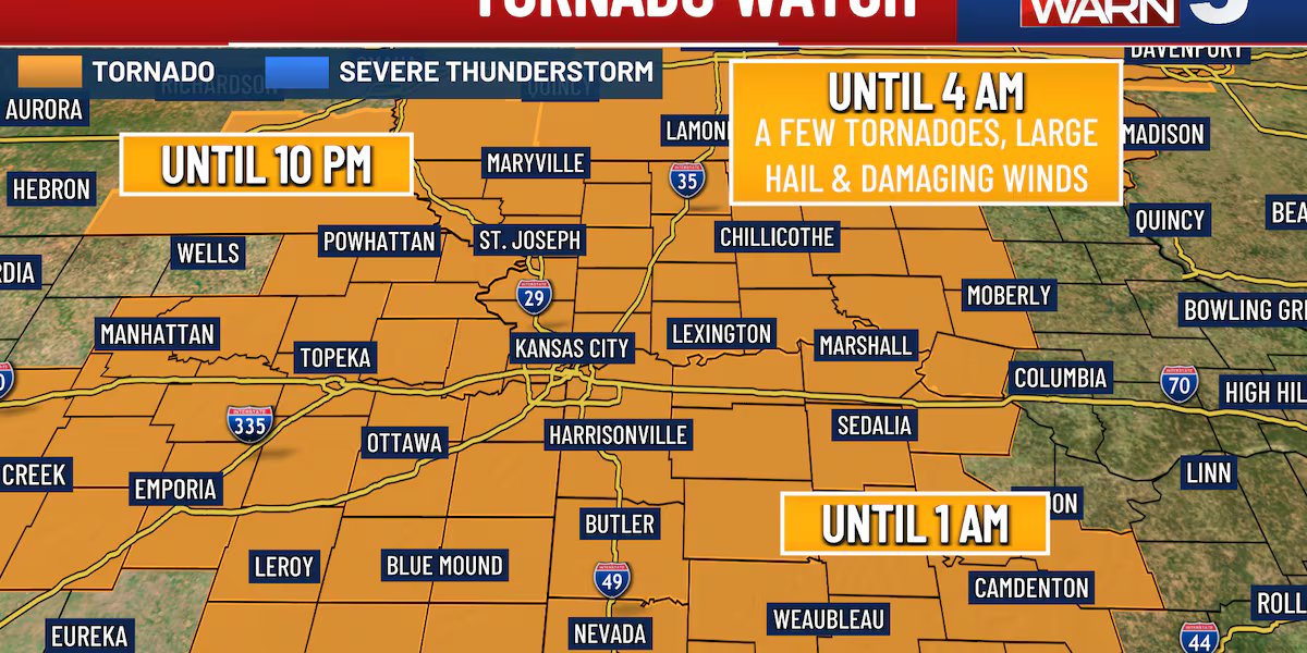 NEW INFORMATION: Almost the entire KCTV5 area is under a Tornado Watch. Our northwestern counties and western border counties are in a tornado watch until 12 am. Tornado Watch for our south and southwest counties continues until 1am. We expect this to be extended until 4am. The KC metro and remainder of the area remain until 4 AM Saturday morning.