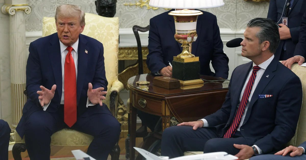 File: Secretary of Defense Pete Hegseth at meeting with President Trump in the Oval Office at the White House on Sept. 3, 2025.