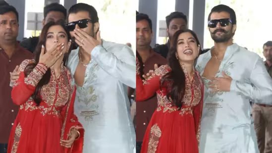 After a grand wedding in Udaipur on February 26, newlyweds Vijay Deverakonda and Rashmika Mandanna arrived at the airport today to head back to Hyderabad for their grand reception. It was a monumental moment for fans and paparazzi alike when Vijay and Rashmika made their first public appearance as husband and wife, or as Srivalli and her real-life Saami, at the Udaipur airport. They walked towards the shutterbugs hand-in-hand, looking like the happiest newlyweds ever, before giving the paps flying kisses. Rashmika’s bridal glow was unmissable, whereas Vijay had a peaceful look on his face as he smiled ear to ear.