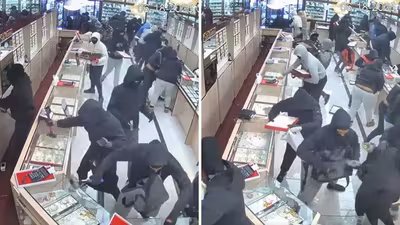 The video, going viral on social media, shows a group of people in hoodies and masks grabbing different items from inside the jewellery store in what the authorities described as a “mob-style takeover”.